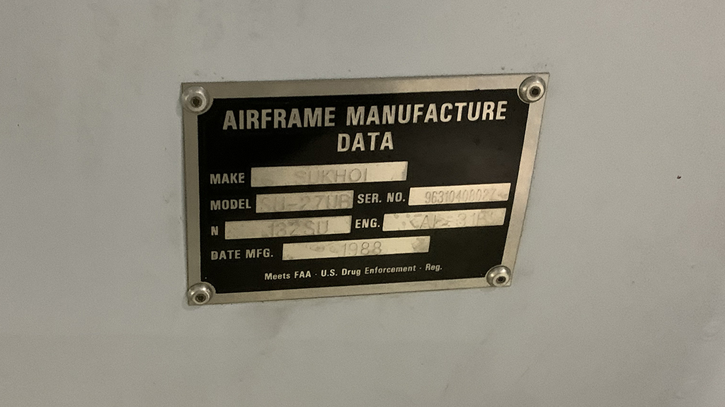 Originally in service with the 831st GvIAP of the Ukrainian Air Force in Mirgorod as “61 Blue” (c/n 96310408027, f/n 05-02, built on Mar. 30 1988), in 2009, it was bought, along with “66 Blue”, demilitarized and transported to the United States inside an An-124 to be delivered to Pride Aircraft in Rockford, Illinois. Once in the U.S., the Su-27s were given the civilian registrations N132SU and N131SU, respectively.