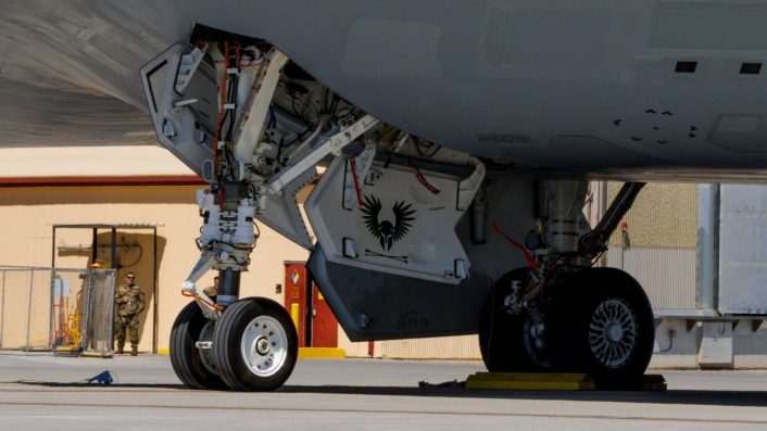 However, while from the first photos to be released it appeared this B-21 did not receive a nickname, the photos from the arrival at Edwards show an interesting detail. In fact, the inside of the nose landing gear door shows a Spartan warrior helmet, possibly hinting that this airframe’s nickname is “Spartan.” The first aircraft, which can also be seen in a hangar in the background – the first photo of the two B-21s together, was named “Cerberus.”