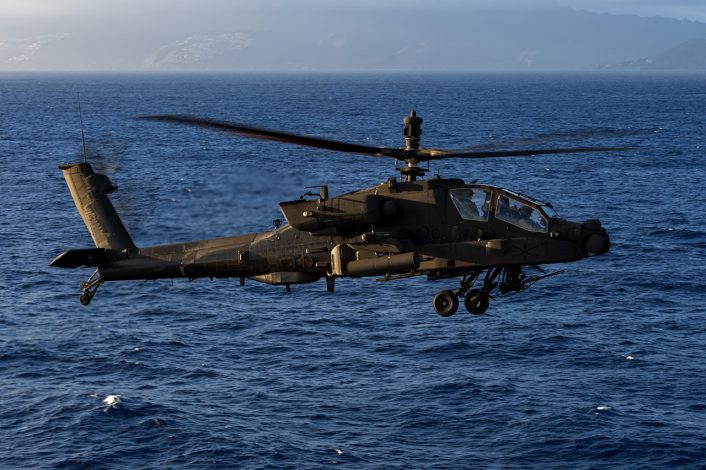 The Apache’s extensive and versatile weapons capability mean it is a very flexible platform. Along with the 30 mm nose-mounted chain gun, the Apache’s wing stations can carry guided missiles, rockets, fuel tanks, and even air to air weapons. Initially developed side-by-side with the Hellfire missile, the Apache today can also fire the AGM-179 Joint Air-to-Ground Missile, Brimstone, and Spike NLOS guided missiles. Unguided rocket pods now have the capability to deliver guided Advanced Precision Kill Weapon System (APKWS) equipped rockets. As well as offering a lighter option against some ground targets, with a higher total payload, the counter-drone capabilities of APKWS mean Apaches can also be deployed in a defensive role against UAVs and one-way attack munitions.