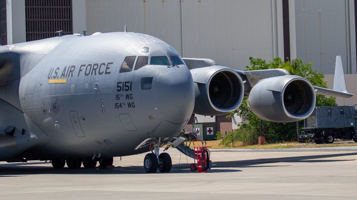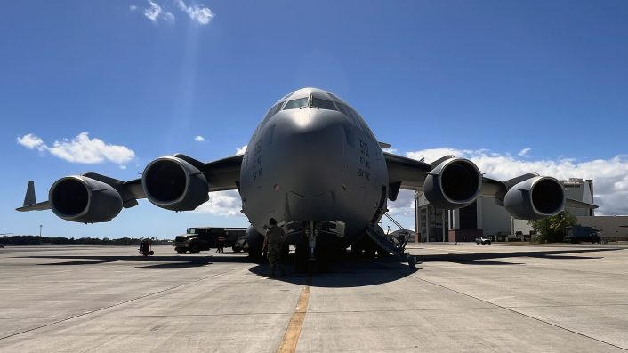 Col. Spathes: There are always plans to address uncertainty. In the C-17 we are ready to respond to whatever happens, and circumstances will change case by case. Do not forget the C-17 has excellent loiter time. If needed, we can take off and simply hold until the threat passes. With our Total Force Integration wing — the 15th and 154th together — we have C-17s, tankers, and fighters. If we need to clear out quickly, we take off, loiter, sustain overhead, then land when it is safe. It may not be a flashy answer, but it shows the versatility you were asking about.