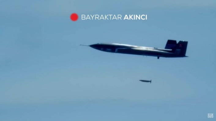 The video released by the company showed the Kizilelma prototype, TC-OZB3 (the third prototype or PT-3), flying two different sorties for each of the munition types from the Flight Training and Test Center in Çorlu. The drone carried a single TOLUN on a SADAK-4T quad rack on the port-side wing and one TEBER-82 on each of the wings.