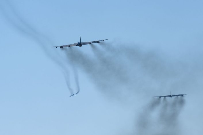 Strategic nuclear bombers, namely B-52 Stratofortresses and B-2 Spirits, are one of the most prominent parts of Global Thunder exercises. Mass scrambles will see aircraft practice minimum interval take-off (MITO) procedures, in the case of the B-52 leaving the skies above full of thick, dark smoke trails. Command and control aircraft, the E-6B Mercury TACAMO birds from the U.S. Navy and the U.S. Air Force’s own E-4B Nightwatch fleet act as they would in a real war, issuing commands via Emergency Action Messages (EAMs) transmitted across a range of frequencies and communication methods. Tanker aircraft, supporting all the other players, also conduct mass launches just as they would in the real operational plan.