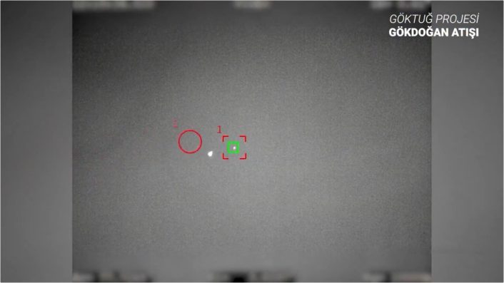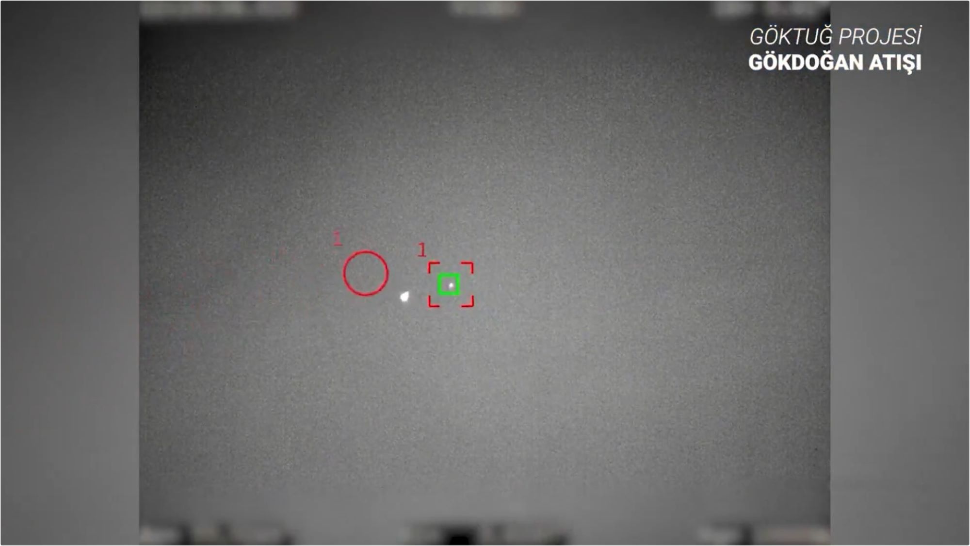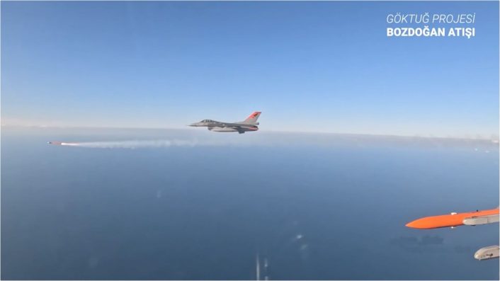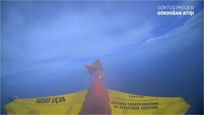 One of the target drones is also captured departing from a ground-based rail launcher. It is not clear if the other two missiles from the starboard (right)-side wing were also fired, as only the Gökdoğan and Bozdoğan from the port-side wing are shown being released.