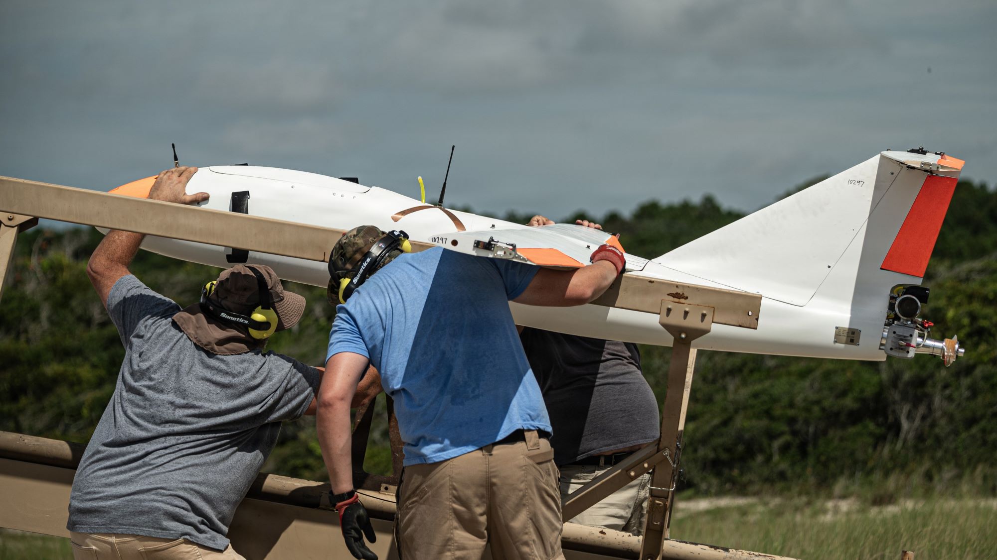 In another image, three Apaches are seen flying at a distance, with the one in the rear equipped with the MUMT-X mast. A target drone, by one of the several industry partners that participated in the event, is also seen being prepared on a ground-based catapult/rail-type launcher.
