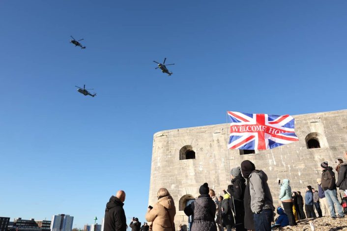 Sailing into HMNB Portsmouth on Sunday Nov. 30, 2025, the homecoming event was watched from ashore by thousands of family members, friends, and excited spectators. Three helicopters, two Merlins and one Wildcat, marked the carrier’s arrival with a formation flypast, while the port’s tug fleet saluted the ship with their water cannons. The ship’s company lined the deck of the aircraft carrier in a Royal Navy tradition known as Procedure Alpha – often carried out at the end of major deployments. A ceremonial cannon salute was fired from the rear of the ship.