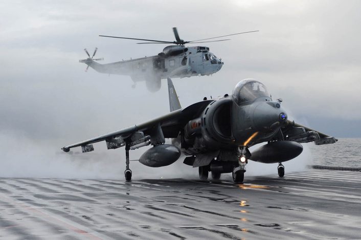 Of course, the carrier-based Harrier still had its use cases, though the earlier withdrawal of the Fleet Air Arm’s Sea Harrier FA2 in 2006 – an air to air combat specialist which would operate in tandem with the ground-attack GR series aircraft – heavily hit the Harrier force’s potency. The last frontline sorties flown by Harriers from the UK’s Invincible class aircraft carriers were reconnaissance patrols over Sierra Leone in 2000. Subsequent operations in Iraq and Afghanistan were all flown from land bases, in the former case with HMS Ark Royal instead being used by helicopters.
