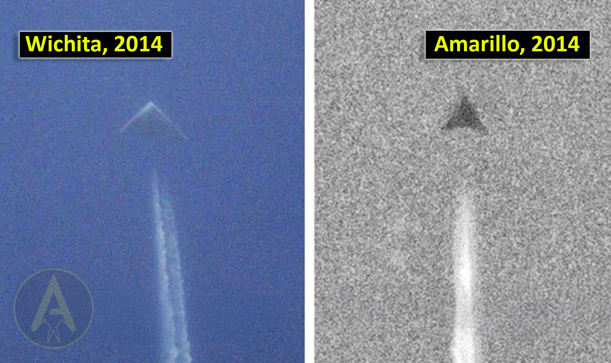 Noteworthy, although it had been taken in February 2014, the image of the mysterious triangular aircraft over Wichita was released in April 2014, roughly one month after another intruguing sighting: on Mar. 10, 2014 Steve Douglass and Dean Muskett took some photographs of three mysterious planes flying at very high altitude over Amarillo, Texas. The images of the three aircraft showed what looked like an almost boomerang-shaped plane, equipped with two engines (or at least two exhaust nozzles), bearing some resemblance, although not identical, to the aircraft spotted over Kansas.