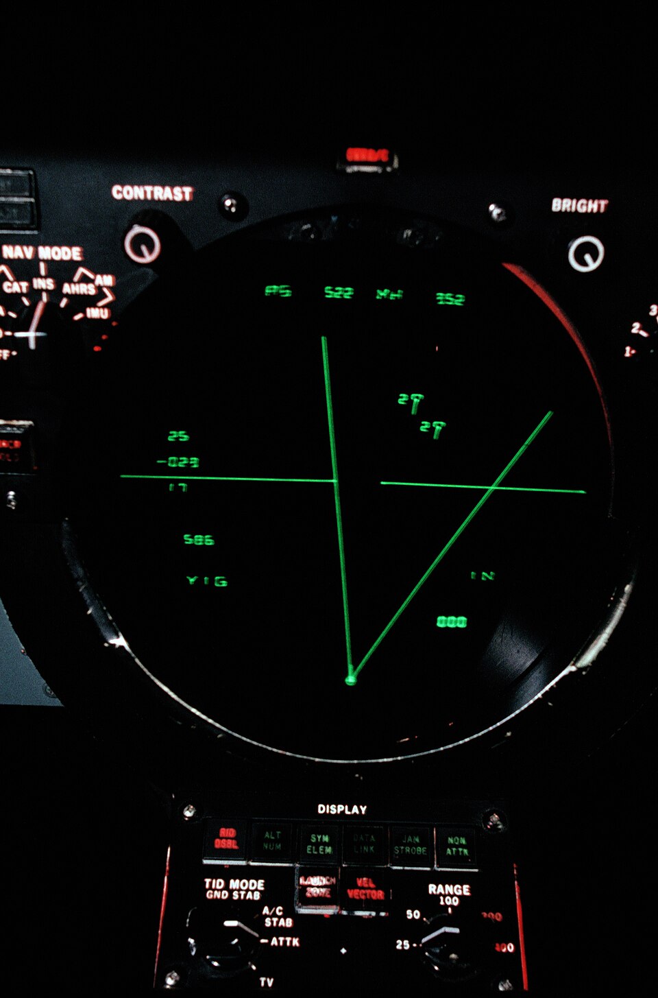 In the RIO’s (Radar Intercept Officer) rear cockpit, two CRT (Cathode Ray Tube) displays, known as the Detail Data Display (DDD) and the Tactical Information Display (TID), displayed information gathered by the AWG-9 system. The DDD displayed basic target information, while the TID presented processed information on a clutter-free screen bringing clarity to a tactical situation with alpha-numeric designations for contacts, as well as altitude, heading, friend or foe identity, and firing priorities for hostile contacts that had been processed and calculated by the computer. The RIO did have the ability to manually override the firing priority if need be.