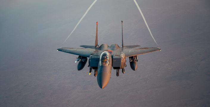 During its service life, the Strike Eagle has proved its use both as a strike aircraft and as an air to air fighter. Famously, during Operation Desert Storm, an F-15E scored an air to air kill against an Iraqi Mi-24 ‘Hind’ helicopter using a laser guided 2000 lb bomb. Air to air weapons like the AIM-9 Sidewinder and AIM-120 AMRAAM are just at home under the Strike Eagle’s wings as bombs, and in recent times the type has also been one of a number seen to be carrying Advanced Precision Kill Weapon System (APKWS) rocket pods for use against small, unmanned aircraft and weapons.