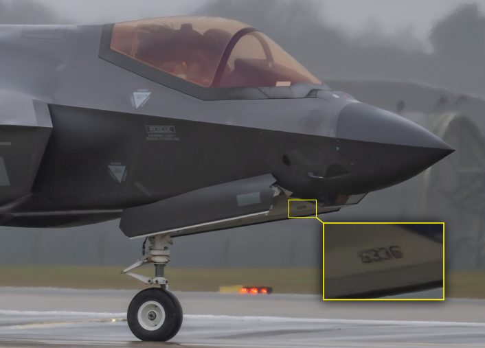 Interestingly, the first of the six F-35s to taxi out for departure had almost all of its identifying marks obscured, while other aircraft flew with full tail numbers visible. Upon close inspection, photos showed that the last four digits of the serial number had been instead painted inside the nose‑wheel door, identifying the F-35 as 18-5336.