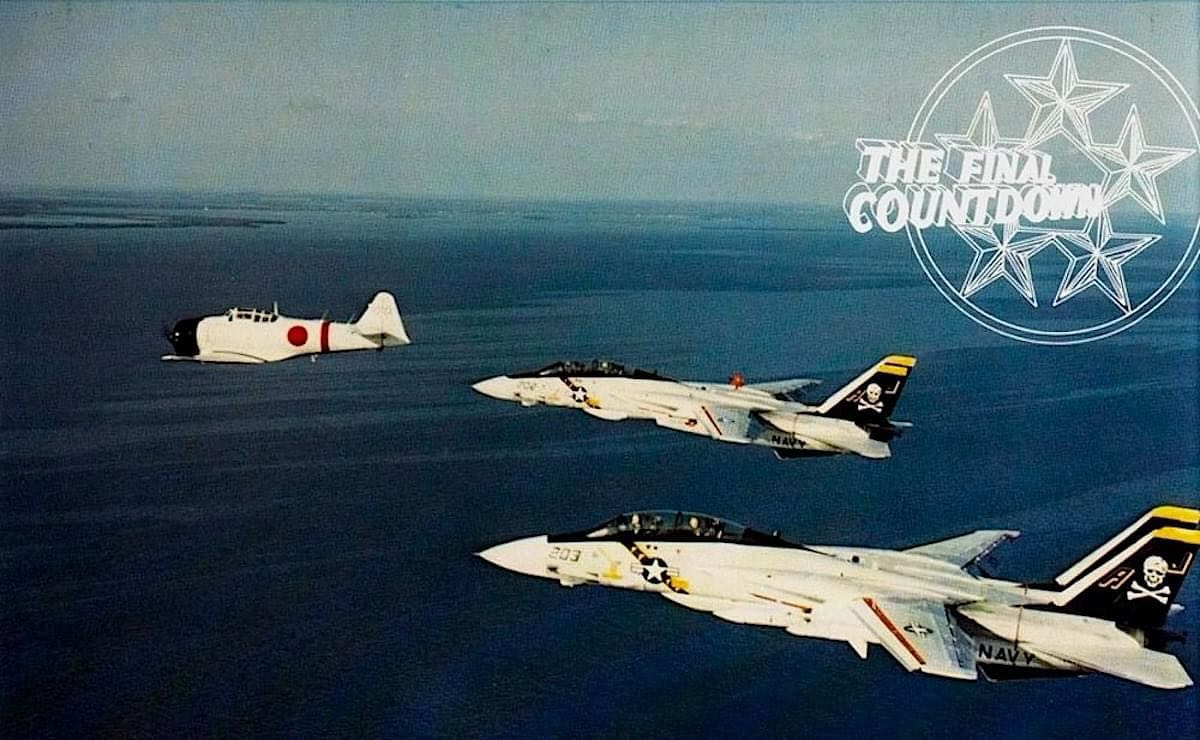 The Jolly Rogers also played a prominent role in the 1980 motion picture The Final Countdown, propelling the unit and the F-14 Tomcat to international notoriety. The movie depicts a time-traveling nuclear-powered USS Nimitz carrier going through a strange electro-magnetic storm and winding up in the Pacific in December 1941, just before the Japanese attack on Pearl Harbor. The film contains some stunning shots of a variety of period aircraft, and scenes show F-14s sporting the skull and crossbones tangling with Japanese Zeros (converted North American T-6 Texans).