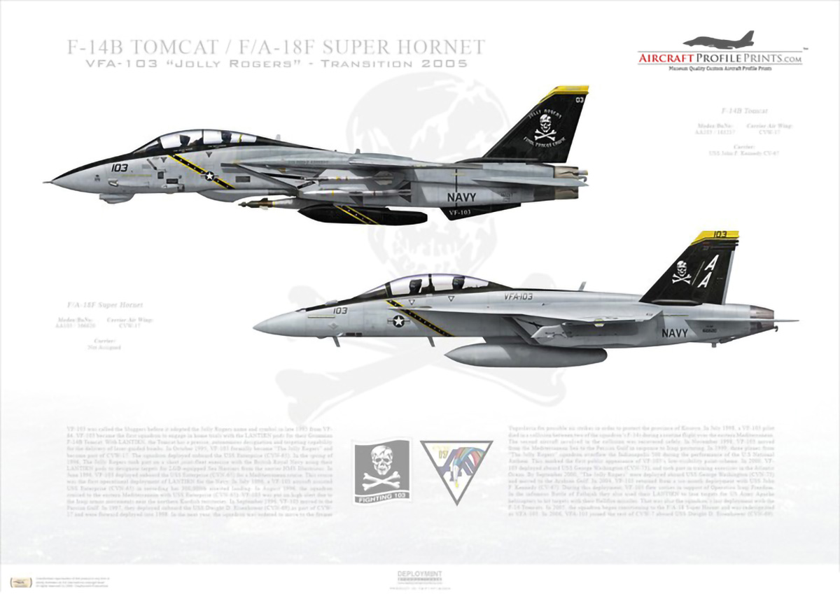 In February 2005, the squadron transitioned to F/A-18 Super Hornets after the retirement of their F-14s in December 2004, and the unit was re-designated as VFA-103 (Strike Fighter Squadron).
