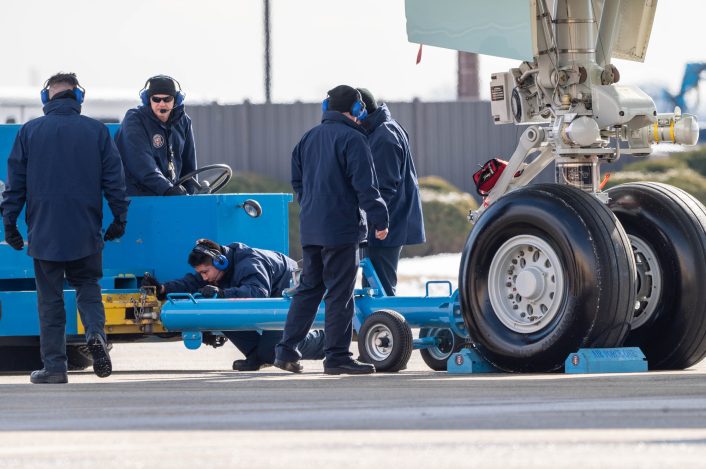 U.S. Airmen assigned to the Presidential Airlift Group pushes Special Air Mission 46 with a pushback tractor prior to former President Joe Biden’s sendoff ceremony at Joint Base Andrews, Md., Jan. 20, 2025. (Image credit: U.S. Air Force Photo)