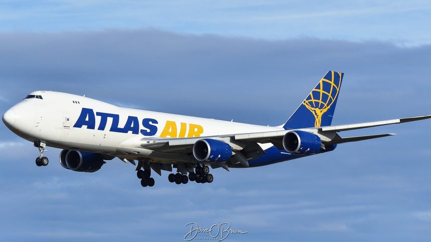 U.S. Air Force operated Atlas Air 747-8 N850GT used for Presidential Airlift Group training at Portsmouth International Airport. (Image credit: Dave O'Brien / @DaveOTGphotog on X)