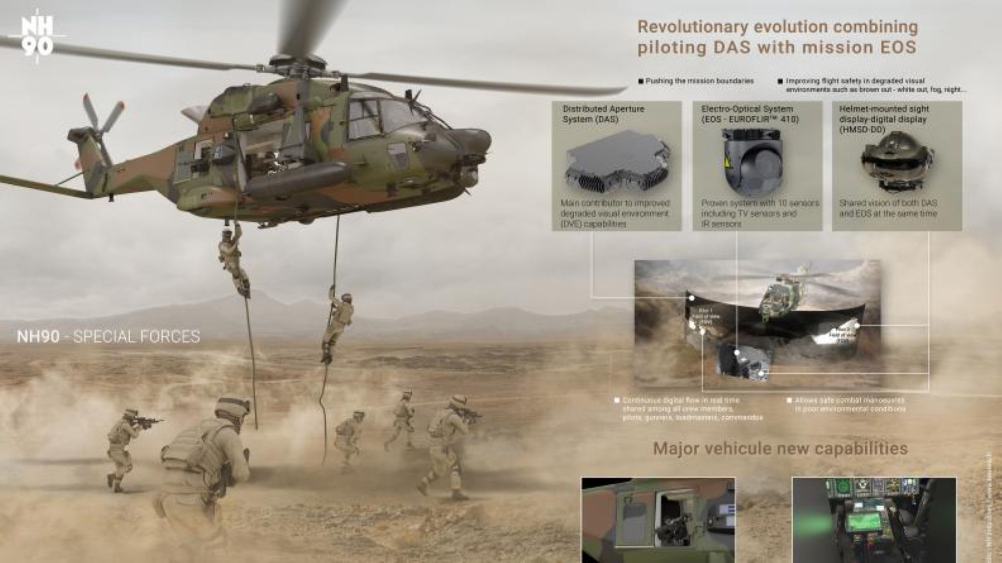 The French Ministry of the Armed Forces and Veterans Affairs says the new NH90 FS (Forces Spéciales – Special Forces) will feature a host of new systems, including a Safran Euroflir 410 electro-optical system that offers infrared modes and a laser tracker, designator and laser-range finder; a Eurofl’eye wide-field Distributed Aperture System (DAS); a TopOwl digital helmet mounted display; fully digital fly-by-wire controls; single-pilot capability; and an automated fault and maintenance diagnostic system. Other structural modifications include a cabin access ramp for personnel and equipment, and enlarged rear sliding windows to accommodate door-mounted machine guns.