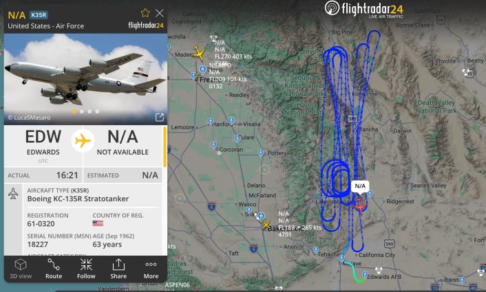 Interestingly, the tanker; serial number #61-0320, designated as an NKC-135 because it carries special equipment required to support the testing of other aircraft, could be tracked online during the whole mission. Flightradar24 data shows that the refueling altitude for the mission was FL230 (23,000 feet).