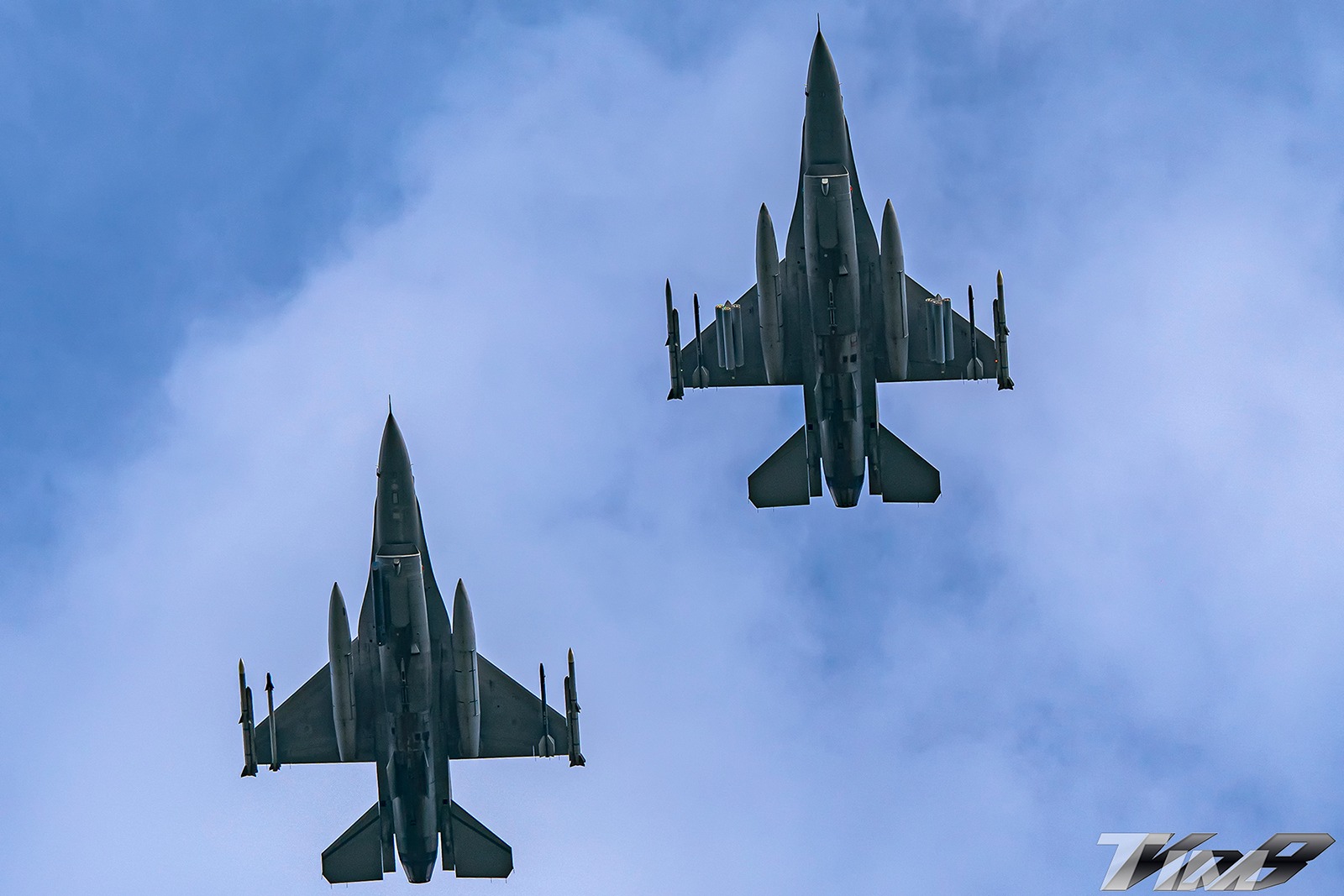 The F-16 is also carrying inert AIM-9 Sidewinder short-range air-to-air missiles (missing the front fins) and AIM-120 Advanced Medium Range Air-to-Air Missile (AMRAAM). A photo of the two F-16s flying overhead shows the second F-16 similarly equipped with AIM-9s and AIM-120s, as well as a Sniper targeting pod.