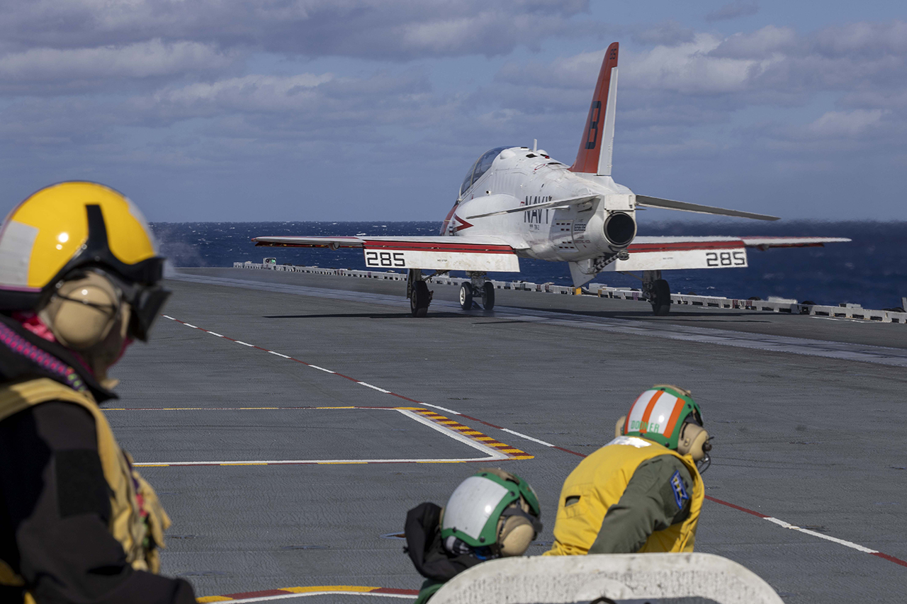 A T-45C Goshawk training aircraft attached to the Training Air Wing (TW) 2 launches from the flight deck aboard the Nimitz-class aircraft carrier USS George H.W. Bush (CVN 77). (U.S. Navy photo by Mass Communication Specialist 2nd Class Nicholas Avis)