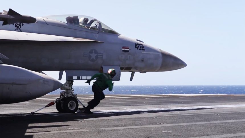 In a video released via the U.S. Central Command (CENTCOM) official social media feeds, 168912 (side number 402) with its kill marking can clearly be seen being prepared for launch from one of the carrier’s two forward catapults.