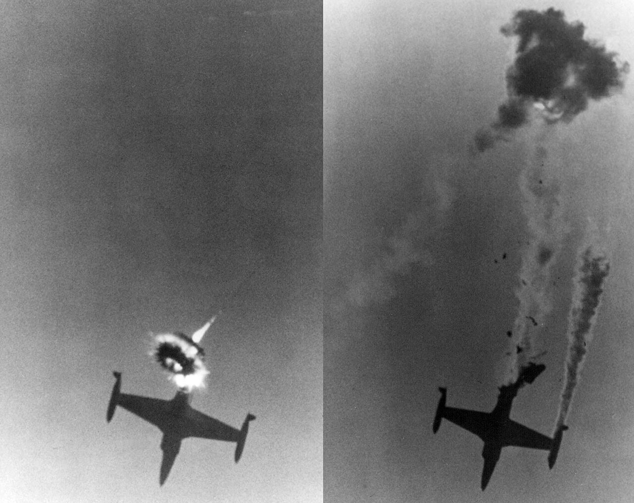 A Lockheed QT-33 drone is hit and destroyed over the U.S. Navy Naval Weapons Center (NWC) China Lake, California, on May 19, 1975. The OT-33 was a target drone version of the T-33 trainer aircraft. (Image credit: United States Navy)