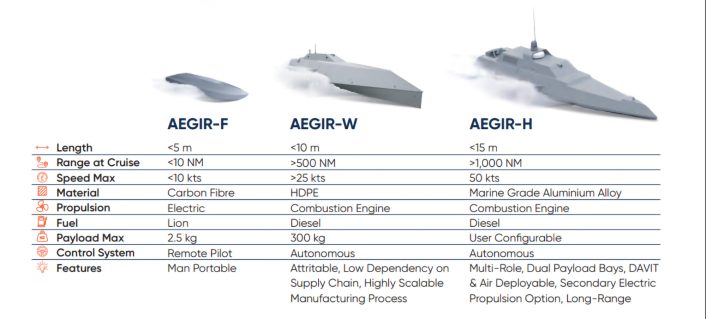 The other USVs in the family are the smaller AEGIR-F and the larger AEGIR-H. The former is “specifically designed for single use, kinetic missions in the final operational mile,” suggesting a use as a kamikaze USV.