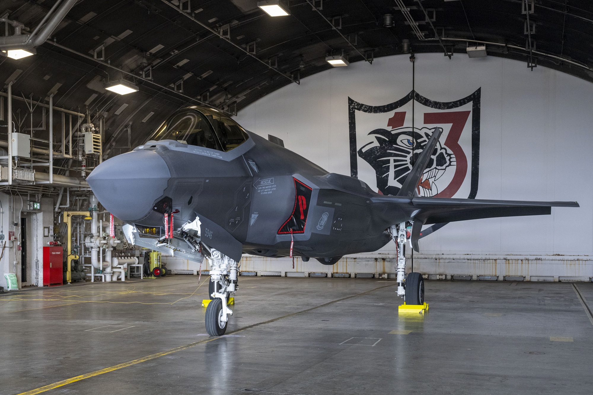 A U.S. Air Force F-35A Lightning II assigned to the 13th Fighter Squadron (FS) sits in a hangar with the 13th FS logo during the F-35 first aircraft arrival at Misawa Air Base, Japan, March 28, 2026. (Image Credit: U.S. Air Force photo by Senior Airman Patrick Boyle)