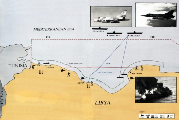 Libyan strongman Muammar Qaddafi had repeatedly been a thorn in the side of the United States and her allies for years, thought to be a sponsor of terrorist organizations as well as training militants to carry out terrorist acts. Qaddafi had declared territorial rights over much of the international waters of the Gulf of Sidra, daring the United States to cross his ‘Line of Death’.