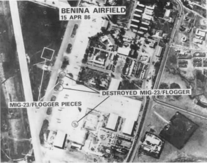 Intelligence collected by the Blackbirds demonstrated the effectiveness of the raid, with all targets being struck. At Benina Airfield four MiG-23 fighters, two Fokker F-27s, and a pair of Mil Mi-8 helicopters were destroyed by the Navy aircraft. Al Jamahiriyah Barracks was also hit.