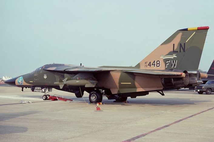 A USAF General Dynamics F-111F from the 48th Tactical Fighter Wing departs RAF Lakenheath, on Apr. 14, 1986 and part of ‘Operation El Dorado Canyon’. This aircraft, armed with 500 lb Mk 82 bombs, was one of six that were to attack military aircraft at Tripoli Airport. (Image Credit: United States Air Force/SSgt. Woodward)