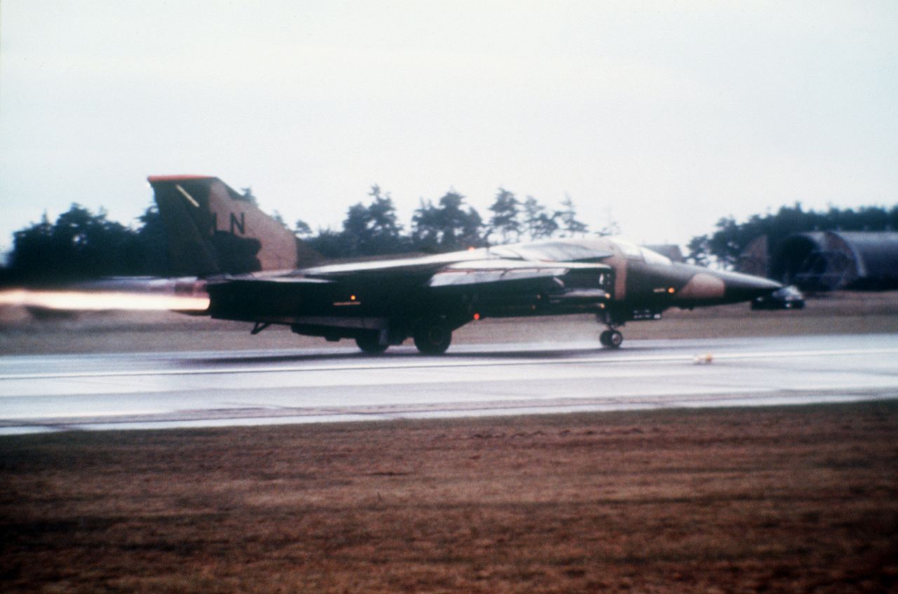 A USAF General Dynamics F-111F from the 48th Tactical Fighter Wing departs RAF Lakenheath, on Apr. 14, 1986 and part of ‘Operation El Dorado Canyon’. This aircraft, armed with 500 lb Mk 82 bombs, was one of six that were to attack military aircraft at Tripoli Airport. (Image Credit: United States Air Force/SSgt. Woodward)
