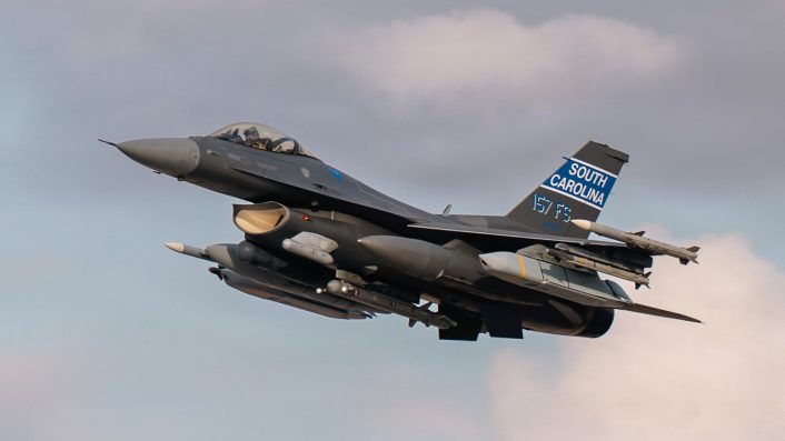 The images showed two F-16CM Block 52s from the South Carolina Air National Guard’s (SCANG) 169th Fighter Wing, as identified by the “South Carolina” and “Swamp Foxes” markings emblazoned on their vertical stabilizers. The aircraft were flying with two AGM-158s JASSMs, one on each wing.